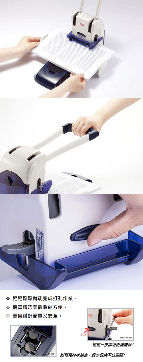DP-200設計以安全、簡單、好操作為原則,例如大型超好握的舒適握柄,輕輕一壓便能為200張紙打孔,還有可依據紙張寬度調整輔助紙架,增加打洞時穩定度;抽屜式紙屑收集槽清理打孔紙屑非常方便快速;打孔機內附專用刀刃4支與專用墊片6片,貼心又大方!