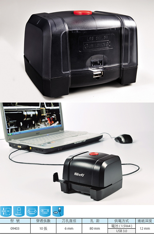 1.可使用USB接電腦供電使用,也可以直接安裝1.5V電池四顆使用。2.簡易式按鈕操作,方便使用。3.一體成型外殼,展現流線的現代設計美感。4.具備卡紙時,自動退紙鈕,避免因卡紙而故障。 ‧ 穿透能力:厚度1.0mm/10張紙 ‧ 規格尺寸:122x108x90mm
