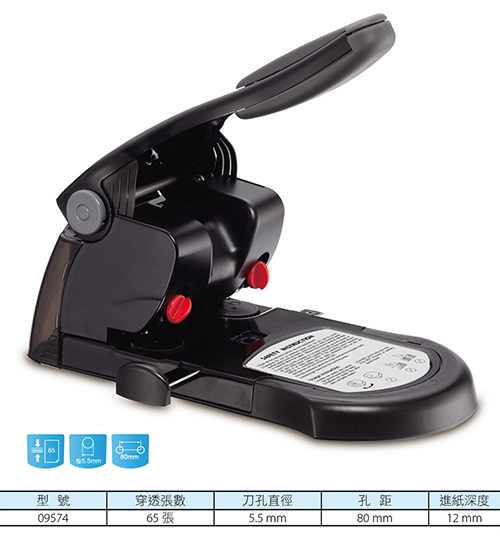 1. 省力結構設計比傳統打孔機可節省50%施力。 2. 合金鋼製刀刃及可換式設計,打孔俐落,孔緣漂亮。3. 附紙張定位尺,操作簡單方便。 4. 建議換刀設計,方便使用者更換。 5. 可輕易穿透厚度6.5 mm約65張紙。 ‧ 穿透能力:厚度6.5mm/65張紙 ‧ 規格尺寸:384x90x350mm 操作說明下載