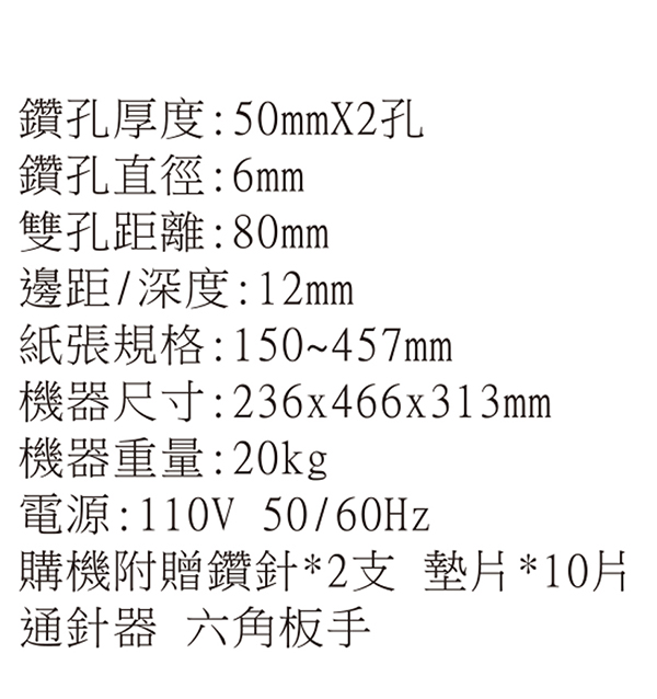 產品說明鑽孔厚度 : 50mm X 2孔鑽孔直徑 : 6mm雙孔距離 : 80mm邊距/深度 : 12mm紙張規格 : 150~457mm機器尺寸 : 236x466x313mm機器重量 : 20kg電源 : 110V 50/60Hz購機附贈鑽針 X 2 、 墊片 X 10片、通針器、六角板手