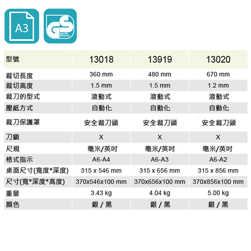 規格尺寸 : 370×656×100mm裁切寬度 : 480mm裁切能力 : 厚度 1.5mm 15張 80g紙張1. 滾動式刀頭,安全精準裁切2. 刀頭更換方便,產品容易拆卸3. 適用裁切紙張、照片、卡片等