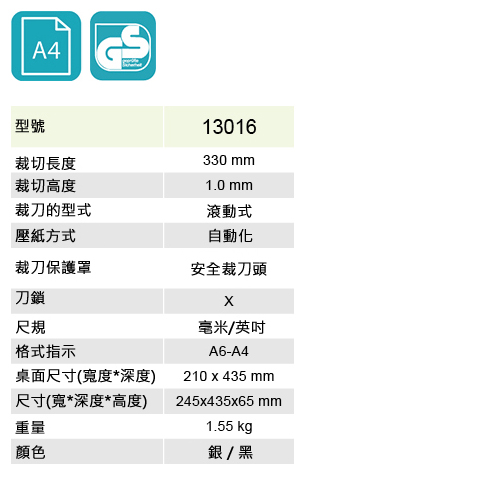 規格尺寸 : 245×435×65mm裁切寬度 : 330mm裁切能力 : 厚度 0.7mm 7張 80g紙張1. 滾動式刀頭,安全精準裁切2. 刀頭更換方便,產品容易拆卸3. 適用裁切紙張、照片、卡片等
