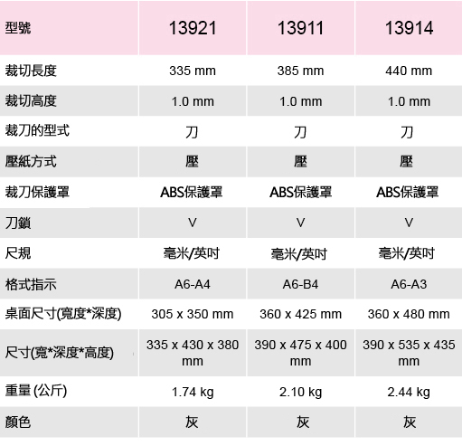 規格尺寸 : 335×430×380mm裁切寬度 : 335mm裁切能力 : 厚度 1.0mm 10張 80g紙張 產品特色裁切能力:厚度1.0mm 10張 80g 紙張 ABS材質桌面,提供輕量化、造型的設計感、裁切保護罩在裁切時,可保護使用者手部