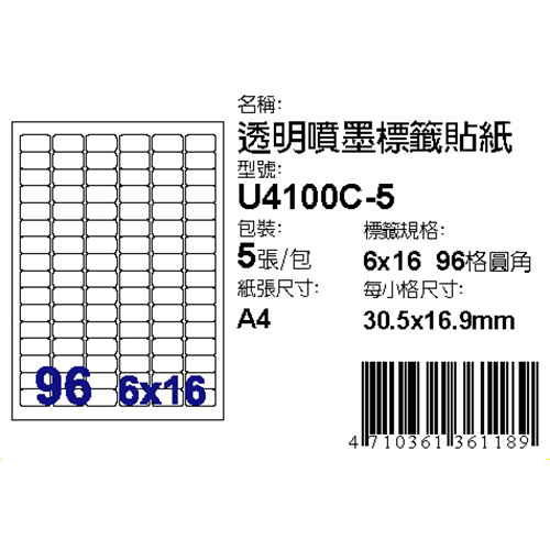 Dr.Paper 30.5x16.9mm 切圓角 NO.96-U4100C-5 96格 透明 A4 雷射噴墨影印自黏標籤貼紙/電腦標籤 5大張入