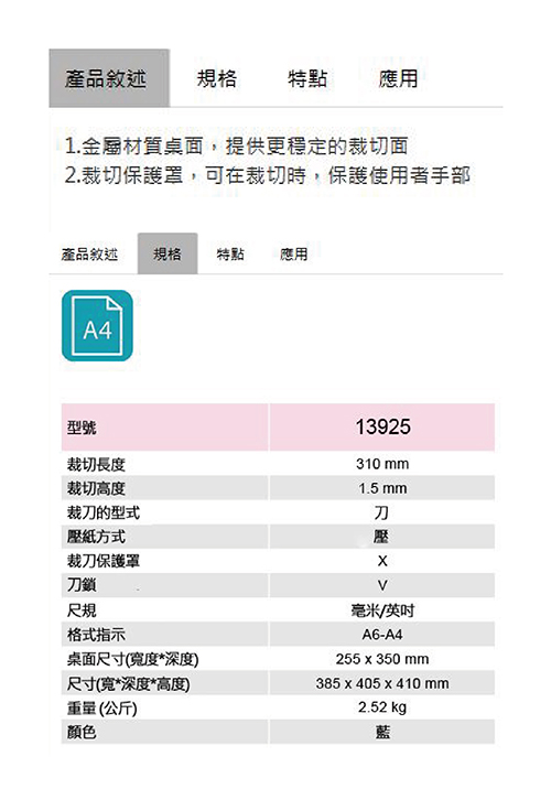 產品代號L5090083產品名稱NO.13925 A4手轉輪式裁紙機/裁刀產品說明規格尺寸:385x405x410mm裁切寬度:310mm裁切能力:厚度1.5mm,15張 80g紙張 產品特色金屬材質桌面,提供更穩定的裁切面。裁切保護罩,可在裁切時,保護使用者手部