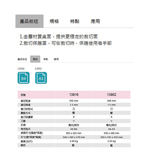 產品代號L5090085產品名稱NO.13916 B4鐵床裁紙機/裁刀產品說明規格尺寸:340x480x470mm裁切寬度:392mm裁切能力:厚度1.5mm,15張 80g紙張 產品特色金屬材質桌面,提供更穩定的裁切面。裁切保護罩,可在裁切時,保護使用者手部。