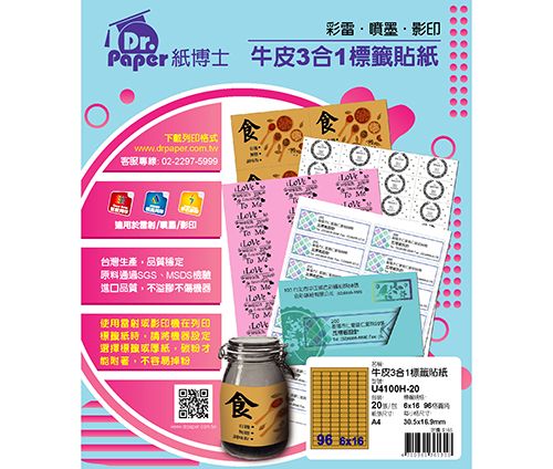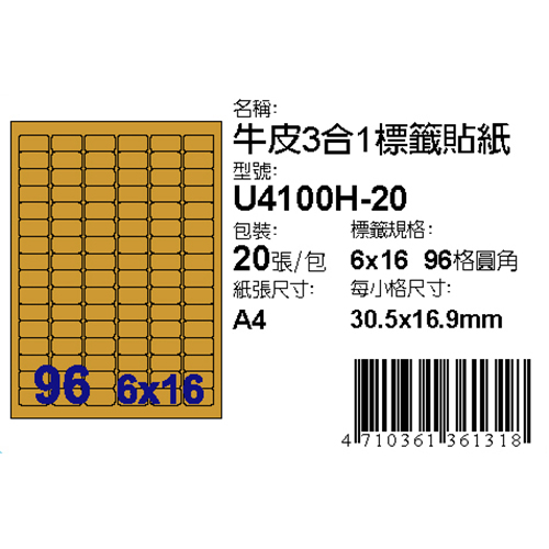 Dr.Paper 30.5x16.9mm 切圓角 NO.96-U4100H-20 96格 牛皮 A4 雷射噴墨影印自黏標籤貼紙/電腦標籤 20大張入