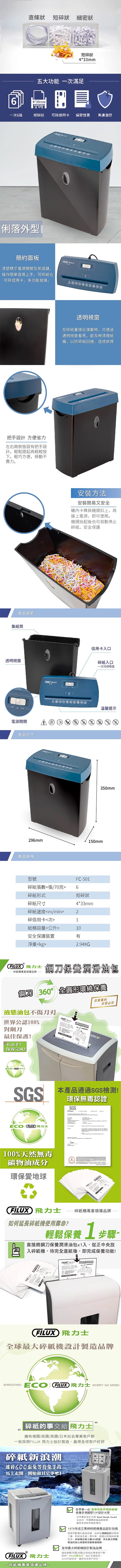型號:FC-501、手動碎紙量(70g/張):6張、入紙口寬度:220(mm)、碎紙尺寸:4*33(mm)、紙桶容量:10(公升)