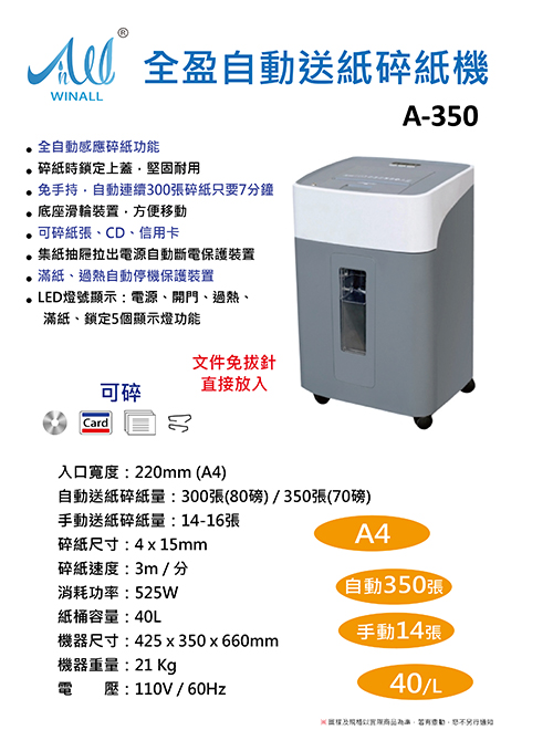 自動送紙碎紙量 : 300張(80磅) / 350張(70磅)