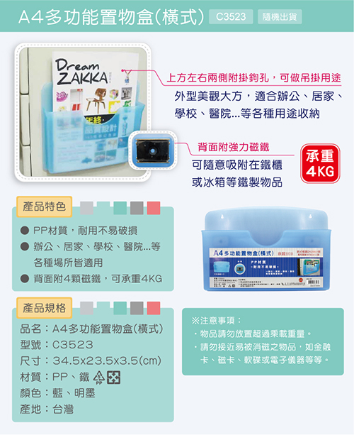 尺寸: 34.5x23.5x3.5cm顏色: 藍、明墨 隨機出色▶A4尺寸美觀大方多功能收納盒▶PP材質,耐用不易破損▶辦公、居家、學校、醫院等各種場所皆適用▶背面附四顆磁鐵,可承重4kg若需指定顏色、可先詢問庫存數量是否足夠.如需訂貨約等候1~3天方可出貨(不含例假日)。