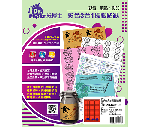 Dr.Paper 30.5x16.9mm 切圓角 NO.96-U4100R-20 96格 紅 A4 雷射噴墨影印自黏標籤貼紙/電腦標籤 20大張入