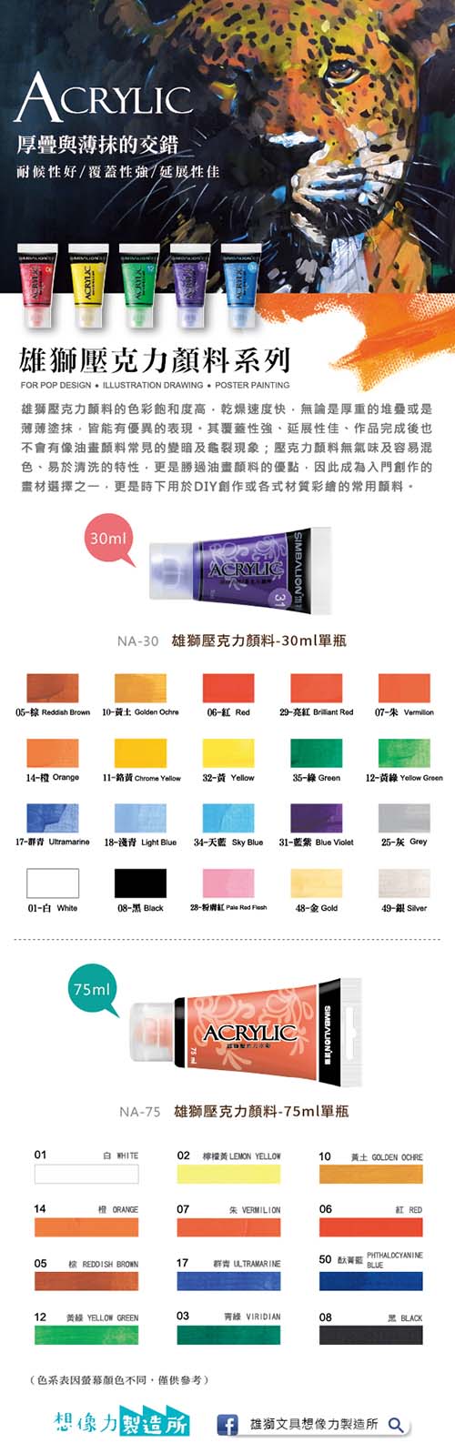 壓克力顏料是一種相當新潮、活潑、趣味、多元化的畫材,可以保持相當的色鮮豔度,不會有油畫變暗及龜裂的現象,是所有繪畫材料中耐久性最好的畫材。不但可以模擬水彩、淡彩、油畫的畫作效果,而且防水、速乾、穩定度高、顯色力強、附著力好,比廣告顏料更好的保存功能。
