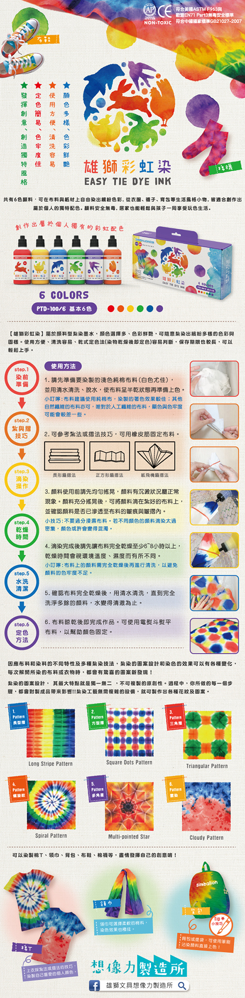 雄獅彩虹染屬於顏料型紮染墨水,顏色選擇多、色彩鮮艷,可隨意紮染出繽紛多樣的色彩與圖樣。使用方便、清洗容易、乾式定色法(染物乾燥後即定色)容易判斷,保存期限也較長,可以輕鬆上手。