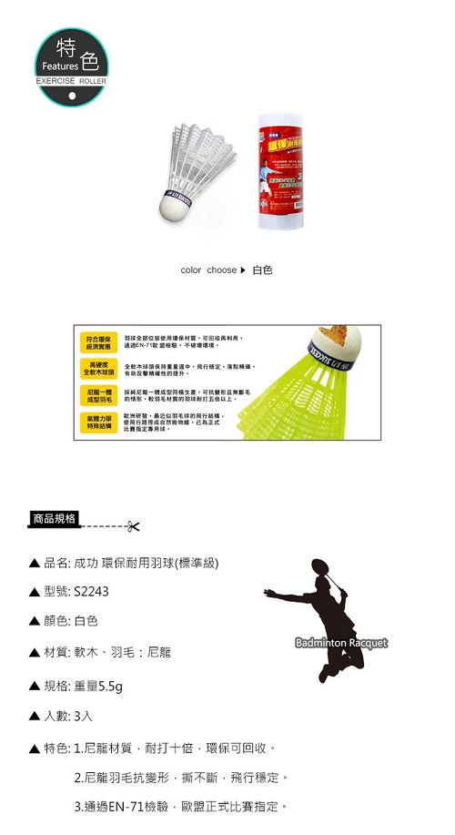 SUCCESS 成功 標準級耐用羽球/羽毛球 (3入)/筒裝 NO.S2243