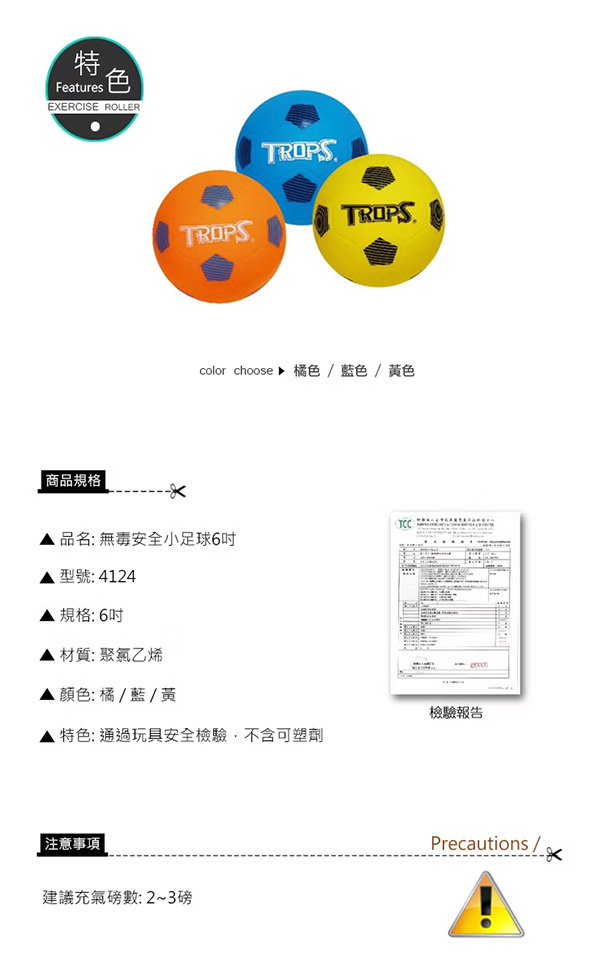 商品規格 :型號:4124顏色:橘色、藍色、黃色規格:6吋[材質] 聚氯乙烯產品特色:1、超軟材質,安全減少運動傷害。2、通過玩具安全檢驗、不含可塑劑。商品下訂前可先詢問顏色數量是否有存貨、避免工廠有缺貨或停產等狀況。