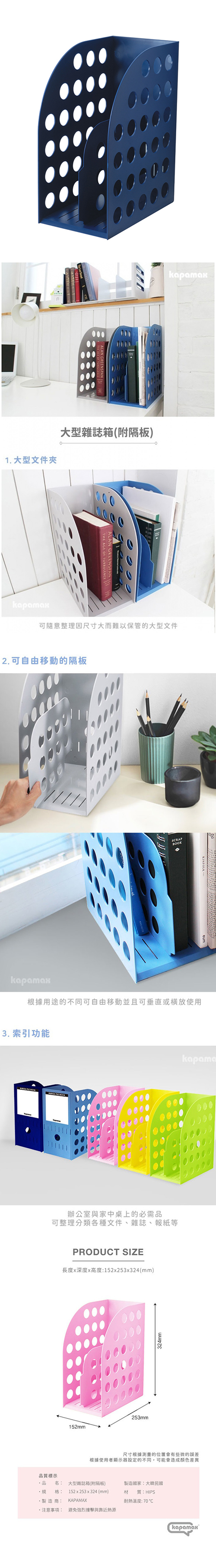 大型雜誌箱(附隔板)可隨意整理因尺寸大而難以保管的大型文件,例如各種文件、雜誌、報紙等根據不同用途可自由移動隔板,並且可垂直或橫放使用尺寸根據測量的位置會有些微的誤差根據使用者顯示器設定的不同,可能會造成顏色差異。內容物說明 品牌地 韓國製造地 韓國尺寸 152x253x324mm材質 HIPS