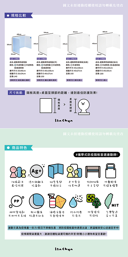 【商品規格】型號:LC-1902L攤平尺寸:高48cm×寬160cm摺疊尺寸:高48cm×寬40cm重量:838g材質:聚丙烯(PP)顏色:透明斜紋本產品添加奈米銀離子抗菌劑好摺疊收納、適合外出人員隨身攜帶使用可水洗重複使用.可用酒精擦拭再消毒