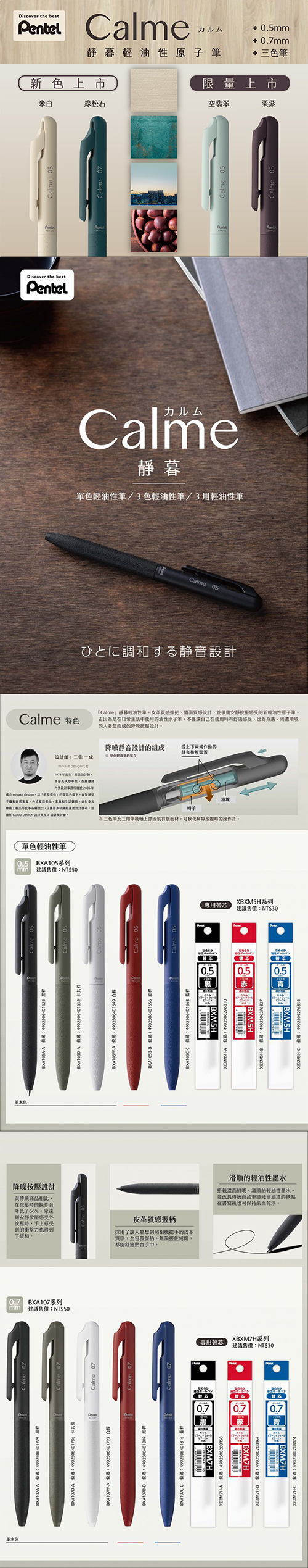 球珠徑 : 0.5mm.內裝黑色筆芯尺寸 : 全長140mm替芯 : (X)BXM5H皮革質感握把、搭配霧面質感筆桿、並俱備降噪按壓設計的Calme靜暮輕油性筆、此次推出四款新色:融入日常生活之中、毫違和感的「米色及綠松石」為定番色。帶有秋天氛圍的「空翡翠」及「栗紫」為限定色。