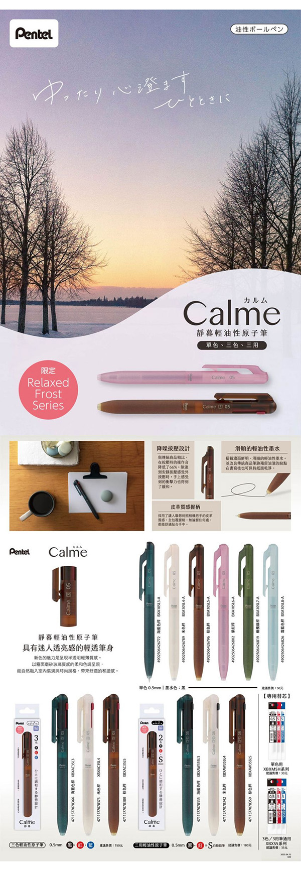 球珠徑 : 0.5mm.內裝黑.紅芯(鮮明滑順的輕油性墨水)+0.5mm自動鉛筆尺寸 : 全長140mm替芯 : XBXS5系列 皮革質感握把、搭配半透明霧面磨砂玻璃質感筆桿、並俱備降噪按壓設計的Calme靜暮輕油性筆
