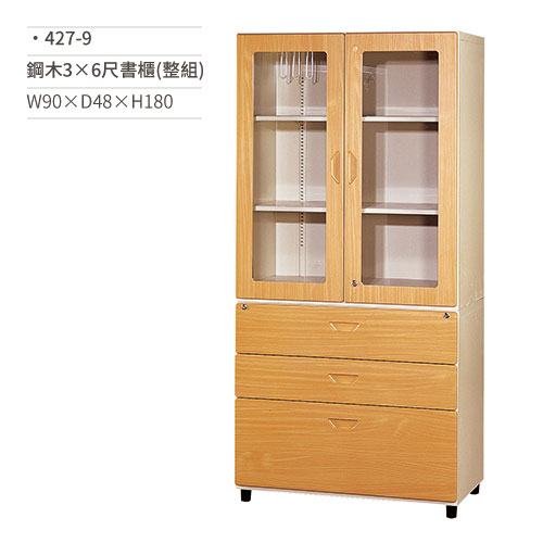 鋼木3×6尺書櫃(整組/開門三層三抽屜)427-9 W90×D48×H180