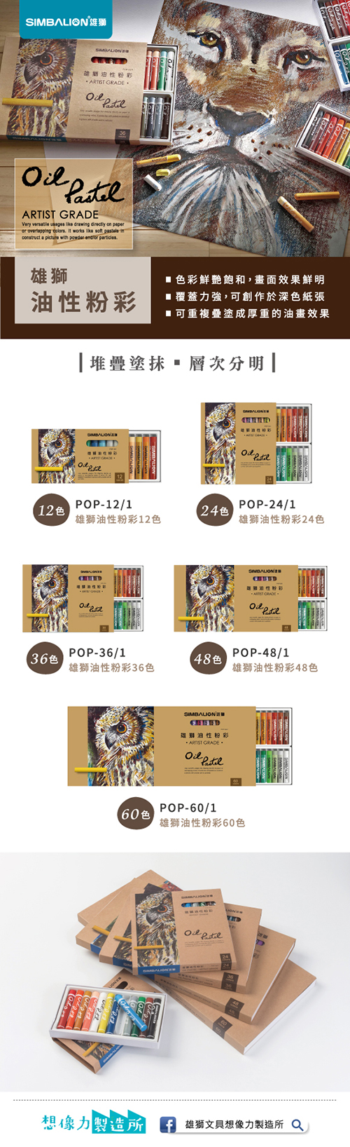 產品特色高濃度顏料配方,專家級油性粉彩擁有強烈而均勻的色彩,使色彩負有極佳覆蓋能力,極高的穩定性,不易變色且耐光性極強!產品說明好推好畫及疊色力佳,大面積的塗抹上色能堆疊出類似油畫般的肌理效果,可使用平塗、堆疊、塗抹等方式,展現出活潑生動的筆觸表現,雄獅油性粉彩也可使用刮畫方式作畫,也另有一番新意及風格!