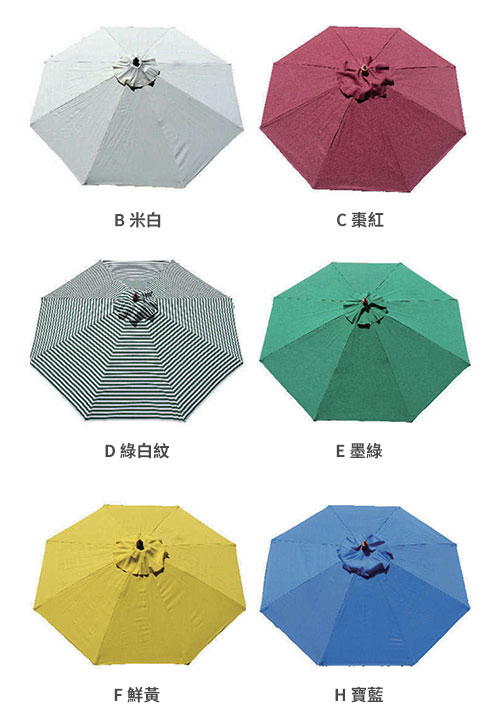 規格約 210×8R/6.8kg傘柱約 ø3.5傘骨約 W1.7×D2.2顏色 : A磚紅 B米白 C棗紅 D綠白紋 E墨綠 F鮮黃 H寶藍(歡迎來電詢問了解)※產品須自行組裝,如有問題,請依原包裝包好,否則不予退貨。圖片佈景,僅供參考,不隨貨附贈。以實體商品為準。