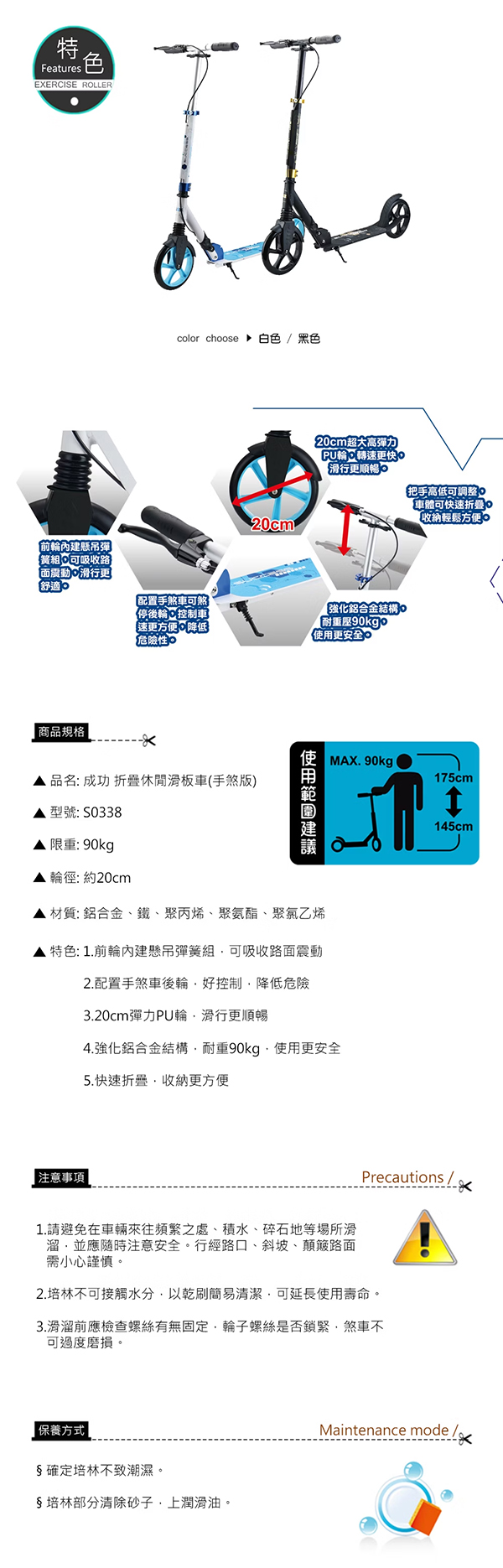 顏色:白色 / 黑色輪徑:約20cm限重:約90kg重量:約4.3kg適合身高:145-175cm收納摺疊:約75x33.5x11cm[材質] 鋁、鐵、聚丙烯、聚氨酯、聚氯乙烯[配件] 六角扳手2支●本賣場無附護具組,需另購買配置手煞車後輪,好控制,降低危險