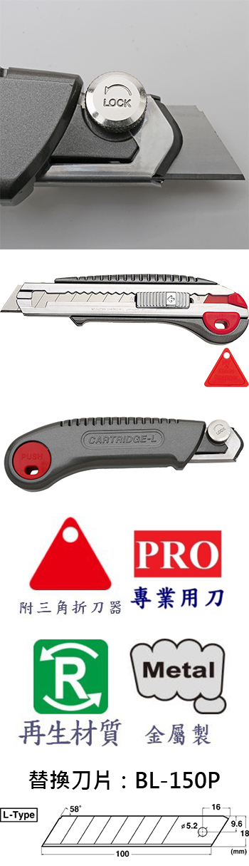 創新的連發系統;當您使用完一片刀片,可快速更換,刀身內可存放六片刀片。前端附固定螺絲,刀片不易滑動,增加安全性。鋁合金壓鑄鋸齒狀刀身,易握防滑,輕便堅固耐用;泡殼包裝。適合專業人士使用。92×230×50mm