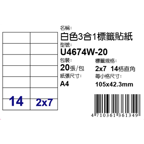 Dr.Paper 105x42.3mm NO.14-U4674W-20 14格 A4 雷射噴墨影印自黏標籤貼紙/電腦標籤 20大張入