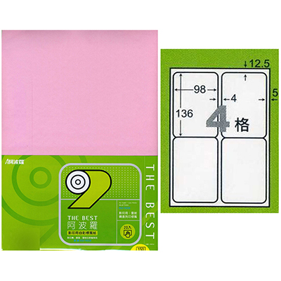 阿波羅 98×136mm NO.9204AP 4格 粉紅 A4 雷射噴墨影印自黏標籤貼紙 20張入