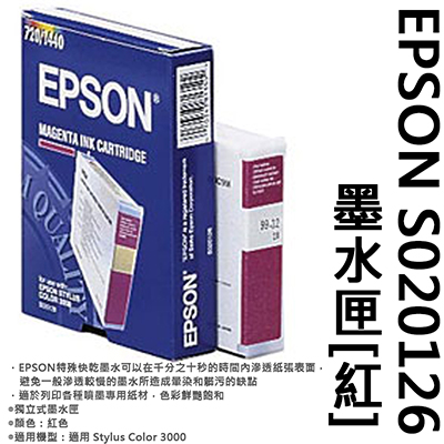 .EPSON特殊快乾墨水可以在千分之十秒的時間內滲透紙張表面,避免一般滲透較慢的墨水所造成 暈染和髒污的缺點 .適於列印各種噴墨專用紙材,色彩鮮艷飽和◎獨立式墨水匣◎顏色:紅色◎適用機型:適用 Stylus Color 3000