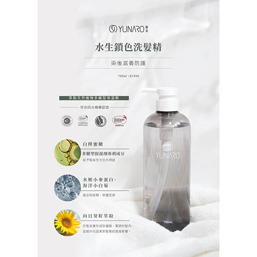 染後滋養防護萃取天然植物多糖型保濕劑符合四大機構認證白樺蜜糖多糖型保濕劑專利成分給予髮絲全方位水潤感。水解小麥蛋白、海洋小白菊富含胱胺酸、修護受損。向日葵籽萃取於髮表層形成防護膜、緊鎖於髮內、延緩外在因素對髮質的直接影響。