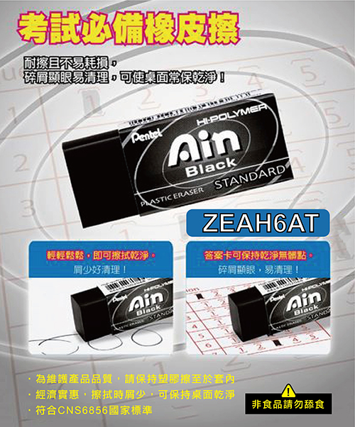 產品代號A7010123產品名稱ZEAH-06AT黑色塑膠擦產品說明1.8x3.4cm產品特色‧為維護產品品質,請保持塑膠擦至於套內‧經濟實惠,擦拭時屑少,可保持桌面乾淨‧符合CNS6856國家標準 非食品請勿舔食