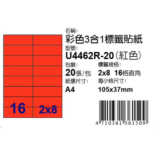 Dr.Paper 105x37mm NO.16-U4462R-20 16格 紅 A4 雷射噴墨影印自黏標籤貼紙/電腦標籤 20大張入