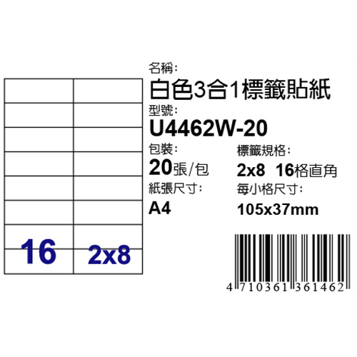 Dr.Paper 105x37mm NO.16-U4462W-20 16格 A4 雷射噴墨影印自黏標籤貼紙/電腦標籤 20大張入