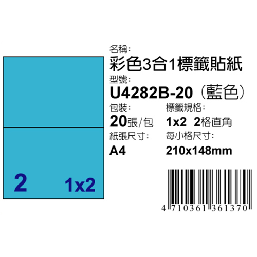 Dr.Paper 210x148mm NO.2-U4282B-20 2格 藍 A4 雷射噴墨影印自黏標籤貼紙/電腦標籤 20大張入