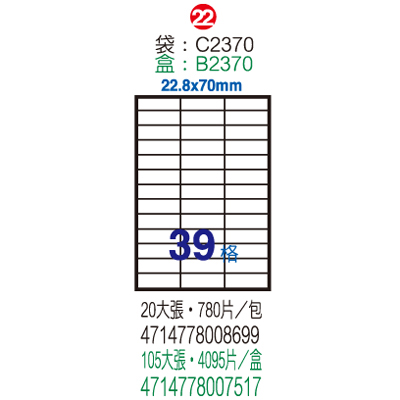 Herwood 鶴屋牌 39格 22.8x70mm NO.B2370 A4雷射噴墨影印自黏標籤貼紙/電腦標籤 105大張入