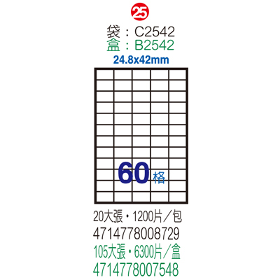 Herwood 鶴屋牌 60格 24.8x42mm NO.B2542 A4雷射噴墨影印自黏標籤貼紙/電腦標籤 105大張入