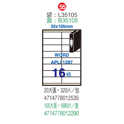 Herwood 鶴屋牌 16格 35x105mm NO.B35105 A4白色雷射噴墨影印自黏標籤貼紙/電腦標籤 16格 105大張入