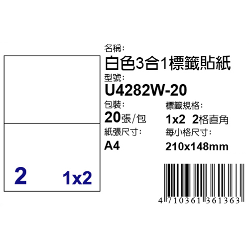 Dr.Paper 210x148mm NO.2-U4282W-20 2格 A4 雷射噴墨影印自黏標籤貼紙/電腦標籤 20大張入