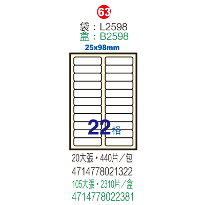 Herwood 鶴屋牌 22格 25x98mm NO.L2598 A4雷射噴墨影印自黏標籤貼紙/電腦標籤 20大張入