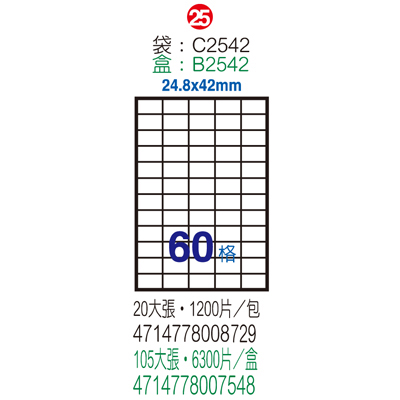 Herwood 鶴屋牌 60格 24.8x42mm NO.LC2542 A4雷射自黏標籤貼紙/電腦標籤 (亮面銅版紙) 20大張入