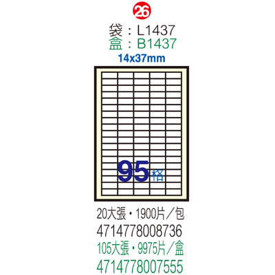 Herwood 鶴屋牌 95格 14x37mm NO.LL1437 A4雷射自黏標籤貼紙/電腦標籤 (亮面銅版紙) 20大張入