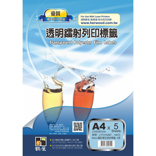 Herwood 鶴屋牌 全張 NO.LTT210297 A4透明雷射專用自黏標籤貼紙/電腦標籤 210x297mm 5大張入
