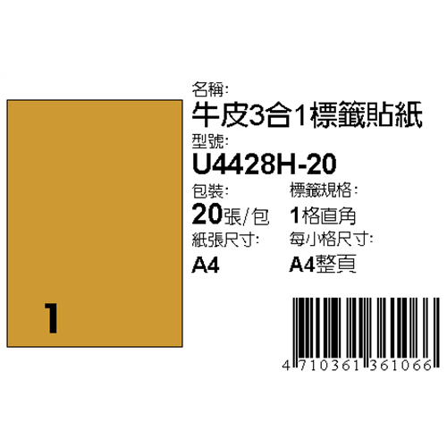 Dr.Paper NO.1-U4428H-20 全張 牛皮 A4 雷射噴墨影印自黏標籤貼紙/電腦標籤 5大張入