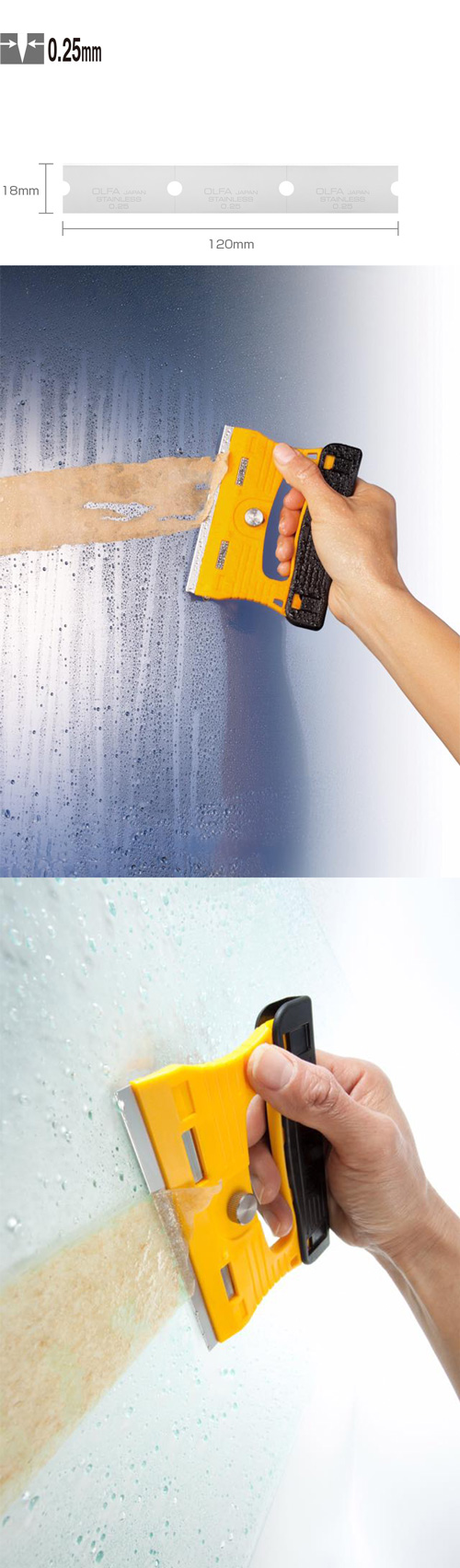 使用超薄設計抗腐蝕之不銹鋼刀片之刮刀、以水和清潔業可專門來刮除黏著在玻璃表面上的物質。2016年新產品使用於GSR-1專業用不鏽鋼玻璃刮刀刀。