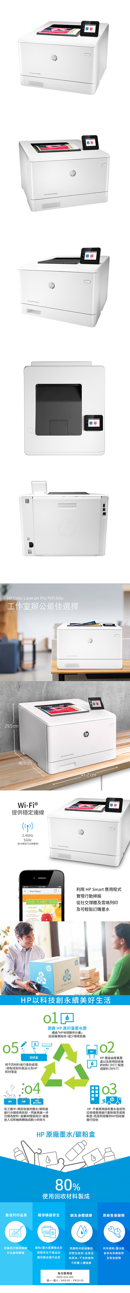 HP Color LaserJet Pro M454dw 彩色無線自動雙面列印雷射印表機可以更智慧工作造就事業成功。HP Color LaserJet Pro M454 印表機經過精心設計,讓您用一台機器處理多項業務,集中精力,提高工作效率,助您發展業務並在業界保持領先的競爭優勢。
