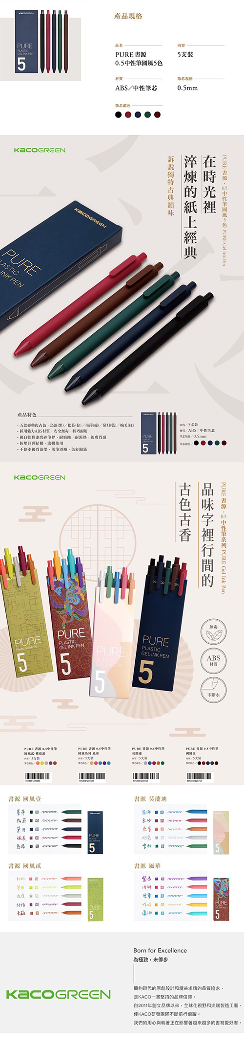 KACOGREEN PURE 書源 國風壹(復古) N18069 0.5中性筆/原子筆 5色組盒裝