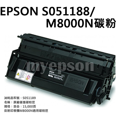 消耗品料號:C13S051188說明:壽命:15、000頁顏 色:黑色備註:是以ISO 19752標準下每張5%列印面涵蓋率,連續列印A4/Letter紙張所測得之概略張數。實際的可列印張數將視頁面的列印密度、紙張大小和列印模式不同而有差異。適用機種:Epson AcuLaser M8000N