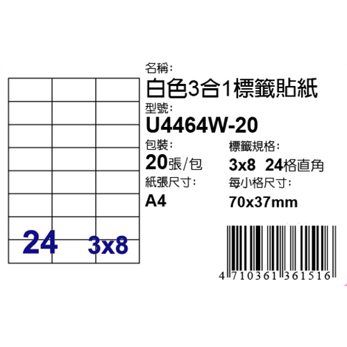 Dr.Paper 70x37mm NO.24-U4464W-20 24格 A4 雷射噴墨影印自黏標籤貼紙/電腦標籤 20大張入
